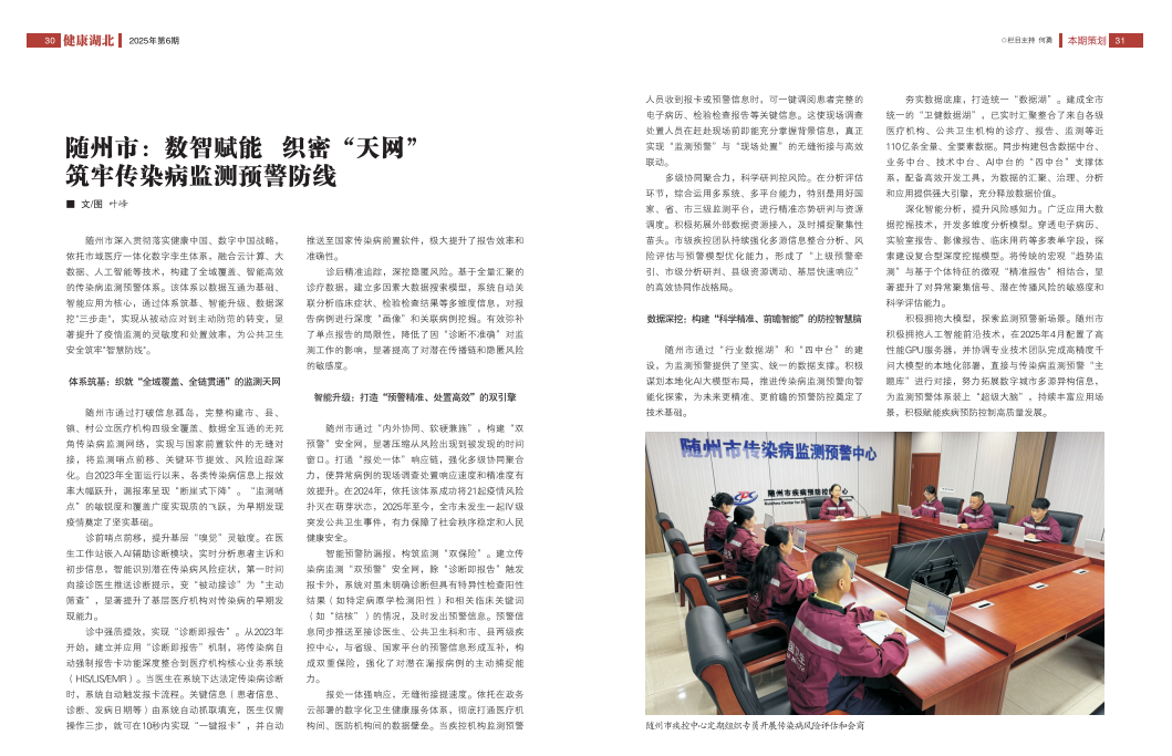 由湖北省卫生健康委主管、省卫生健康宣传教育中心主办的《健康湖北》杂志2025年第6期,专题策划《筑牢公共卫生服务根基》栏目刊载推介随州市传染病监测预警体系建设经验。