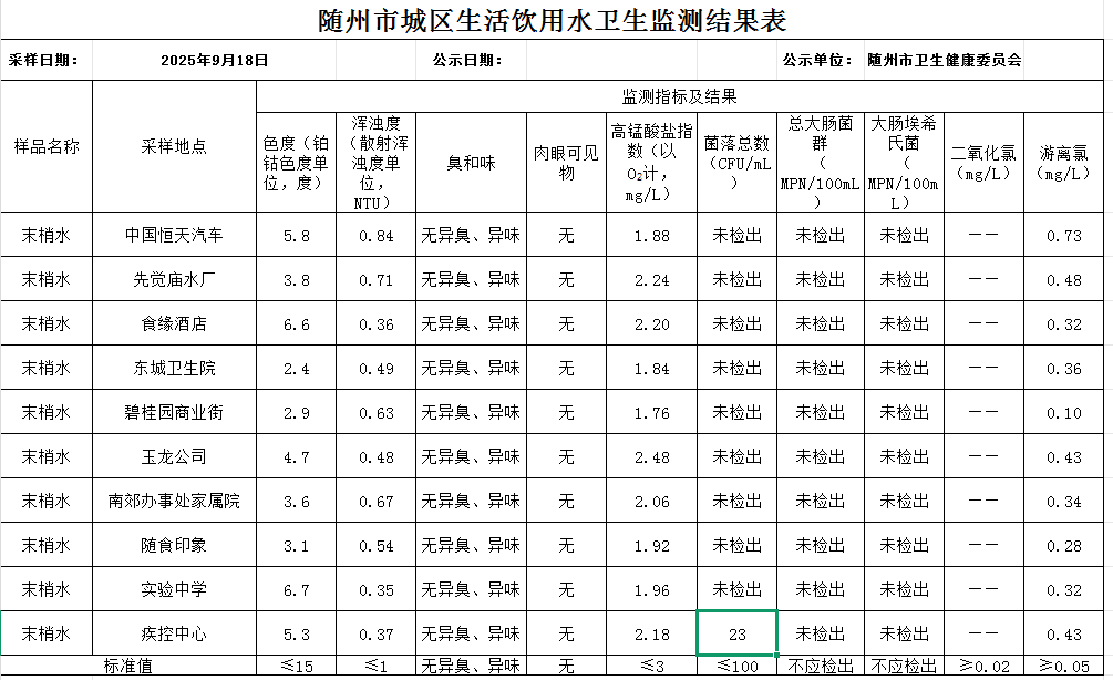 【生活用水监测信息.图表】9.18随州市城区生活饮用水卫生监测结果公示