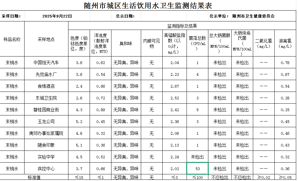 【生活用水监测信息.图表】9.23随州市城区生活饮用水卫生监测结果公示