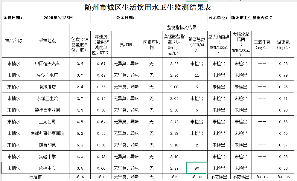 【生活用水监测信息.图表】9.26随州市城区生活饮用水卫生监测结果公示