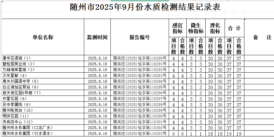 本次抽检1份水源水、1份出厂水、12份末梢水样品,所检项目均符合国家《生活饮用水卫生标准》GB5750-2023、《地表水环境质量标准》GB3838-2002之规定。