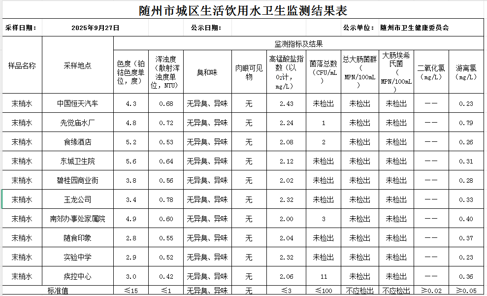 【生活用水监测信息.图表】9.27随州市城区生活饮用水卫生监测结果公示