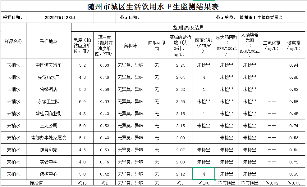 【生活用水监测信息.图表】9.28随州市城区生活饮用水卫生监测结果公示