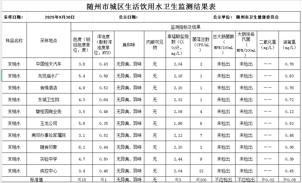【生活用水监测信息.图表】9.30随州市城区生活饮用水卫生监测结果公示