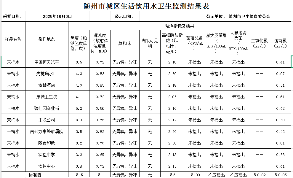 【生活用水监测信息.图表】10.2随州市城区生活饮用水卫生监测结果公示